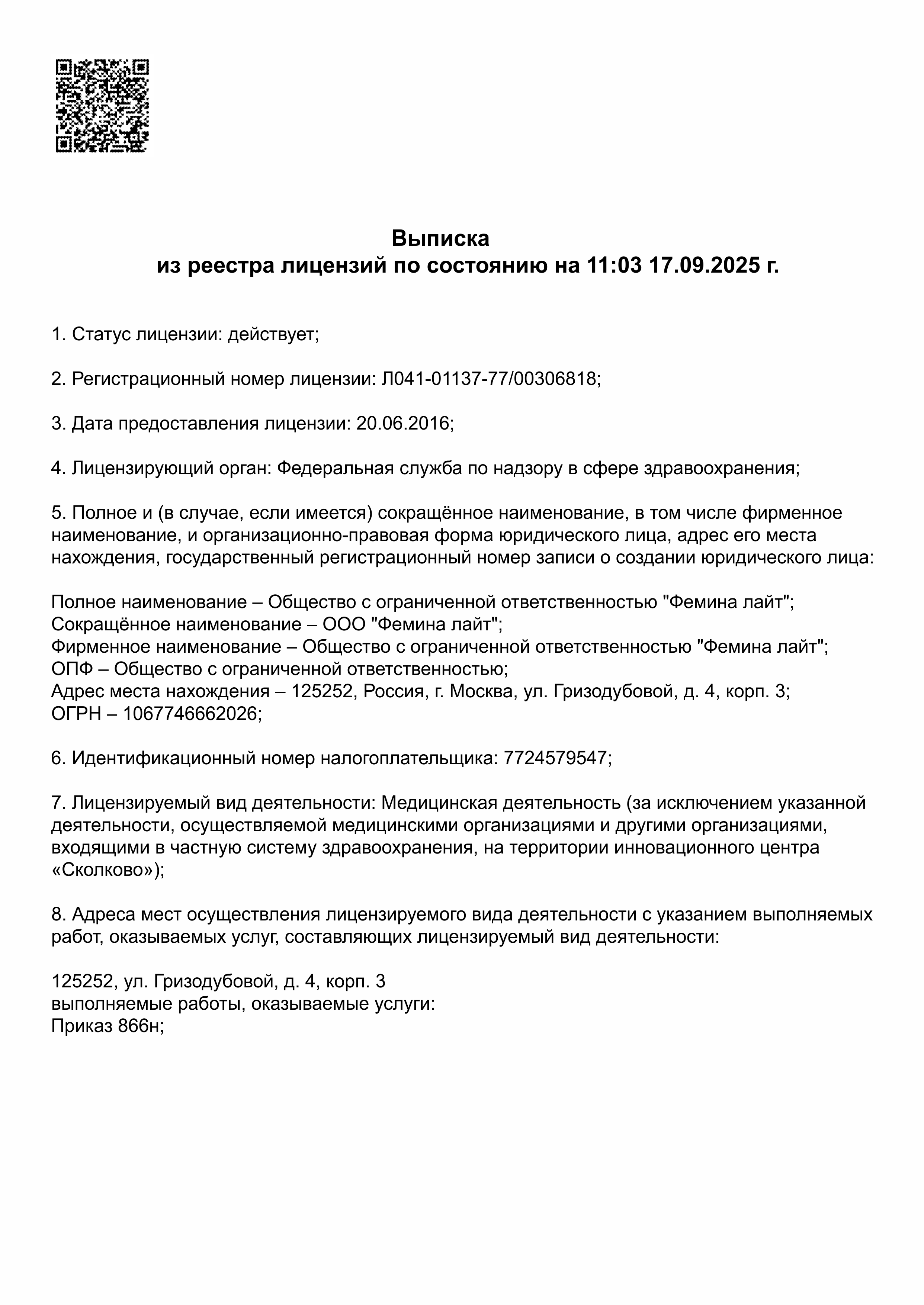 Время работы медицинского центра ООО «ФЕМИНА ЛАЙТ»